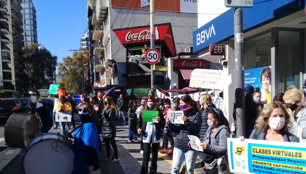 En el caso de los y las docentes de la Escuela N° 7 junto a otras del distrito escolar segundo reclamaron el pasaje a la virtualidad en los colegios bajo la consigna «virtualidad para no enfermar, basta de muertes evitables«.