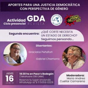 El pasado 16 de junio se llevó a cabo el segundo encuentro acerca de ¿Qué Corte Suprema necesita un Estado de Derecho? Aportes para pensar una Justicia Democrática con perspectiva de género, con la presencia de los abogados Graciana Peñafort y de Gabriel Chamorro.