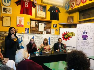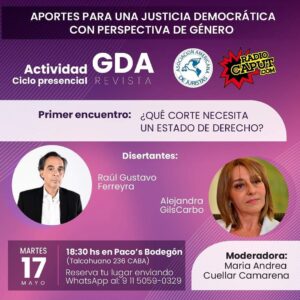 El pasado martes 17 de mayo se llevó a cabo la primera charla del ciclo: Aportes para una justicia democrática con perspectiva de género organizada por Radio Caput  junto a la revista Género y Derecho Actual (GDA) y la Asociación Argentina de Juristas (AAJ), en el Bar Paco´s del centro porteño. El encuentro contó con las exposiciones de la Doctora Alejandra Gils Carbó, ex Procuradora de la Nación, profesora y directora de la carrera de derechos de la Universidad de las Madres de Plaza de Mayo y Doctor Gustavo Ferreyra, profesor de Derecho Constitucional de la UBA e integrante del Consejo Consultivo que convocó el presidente Alberto Fernández para reformar el Poder Judicial.   Al encuentro asistieron la histórica referente del feminismo, el derecho y los Derechos Humanos, Nelly Minyerski, la directora de Radio Caput Elizabet Vega GronElena Mendoza y Marina Ditieri de la revista GDA, mientras que Andrea Cuéllar Camarena la moderó entre unas decenas de interesadxs.  La anfitriona, Elizabet Vega Gron, subrayó que «desde Radio Caput tenemos la misión de potenciar estos debates y que se transformen en los insumos de la futura justicia social»