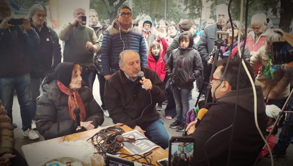 Hugo Yasky se refirió, desde la transmisión radial colectiva detrás del escenario en la avenida 9 de Julio, al encuentro que tuvo lugar este lunes entre el superministro Dujovne y los inversores de Wall Street en Nueva York: “Está claro el gesto, eligió el día de la independencia para ir a encontrarse con sus dueños del FMI para mostrar que Argentina no es independiente”, y agregó: “Si pensaron que estábamos en mesa de saldo, que teníamos colgado el precio de remate se equivocaron. El pueblo argentino va a defender la independencia”.